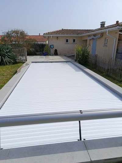 Sur cette piscine 6x3, l’installation du volet roulant hors sol a été réalisée en périphérie du bassin. Le système repose sur un axe motorisé permettant un enroulement fluide et rapide des lames.